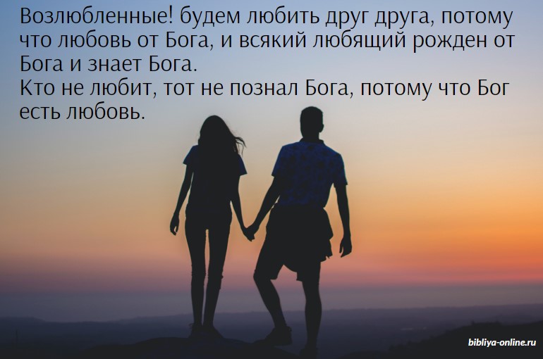 - Возлюбленные! будем любить друг друга, потому что любовь от Бога, и всякий любящий рожден от Бога и знает Бога. Кто не любит, тот не познал Бога, потому что Бог есть любовь. (1Ин. 4,7–8)
