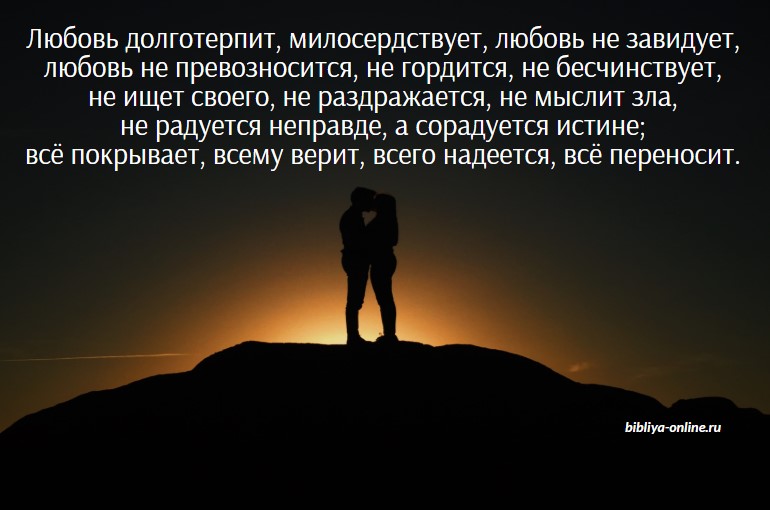 - Любовь долготерпит, милосердствует, любовь не завидует, любовь не превозносится, не гордится, не бесчинствует, не ищет своего, не раздражается, не мыслит зла, не радуется неправде, а сорадуется истине; всё покрывает, всему верит, всего надеется, всё переносит. (1Кор.13,4–8)