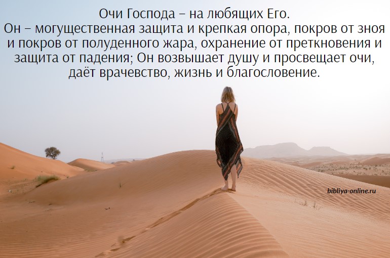 - Очи Господа – на любящих Его. Он – могущественная защита и крепкая опора, покров от зноя и покров от полуденного жара, охранение от преткновения и защита от падения; Он возвышает душу и просвещает очи, даёт врачевство, жизнь и благословение. (Сир.34,16–17)